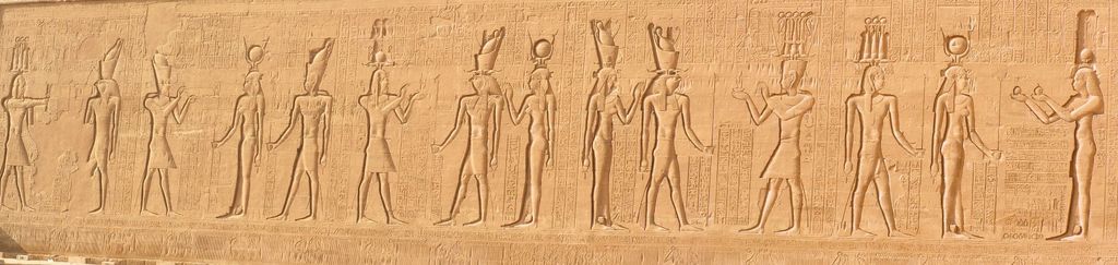 - Le 4 Avril – nous ne passerons l’écluse qu’à 2H00 du matin, la navigation continue de nuit et nous arrivons à Edfou vers 8H30. Nous sommes pris en charge immédiatement, (au milieu d’une foule de calèches enchevêtrées !) par un conducteur Mustaphah et son cheval « Rambo », dommage que la calèche menace de s’écrouler à chaque tour de roues ! nous finissons par traverser la ville et arriver devant le temple d’Horus, où Ahmed, notre guide, donne toute la mesure de sa culture, et nous inonde de renseignements historiques, tous plus intéressants les uns que les autres ! ce que nous avons retenu ? nous ne vous donnerons pas un cours sur l’Egypte ancienne, d’autres sont plus qualifiés pour le faire ! Cependant Edfou est remarquable par son excellent état de conservation, construit à l’ére des Ptolémée (souverains grecs ayant régné sur l'Egypte), et consacré au dieu Horus, c’est aussi le second temple d’Egypte par la taille, l’entrée est gardée par deux superbes statues du dieu Horus, sous la forme d’un faucon, le mur extérieur est orné de bas reliefs représentant Horus et Hathor (mère d’Horus) à remarquer aussi le grand « couloir des libations » avec ses imposantes colonnes. L’ensemble est de toute beauté, malheureusement le retour est gâché par les exigences du conducteur de la calèche, nous n'avons pas retrouvé Mustaphah, sa calèche ayant rendu l'âme ! . On peut comprendre que le niveau de vie, pousse certains à réclamer force « bakchich », mais trop, c’est trop, c’est un problème que nous avons rencontré souvent, et que devra régler l’Egypte, si elle ne veut pas écoeurer les touristes, source de vie pour le pays ! Nous reprenons la navigation vers Assouan, les bords du Nil sont de plus en plus pittoresques, nous sommes maintenant en Nubie, beaucoup de palmiers a bord du Nil, moins de villages, et le désert tout proche avec ses dunes. Nous débarquons à la nuit, pour visiter le temple de Kom Ombo, absolument superbe, avec ses enormes colonnes, sous les projecteurs, consacré au dieu crocodile, Sobek, dieu de la fertilité et à Haroéris, le dieu solaire guerrier. Nous poursuivons ensuite notre navigation vers Assouan, tout proche, arrivée à 21H00-
