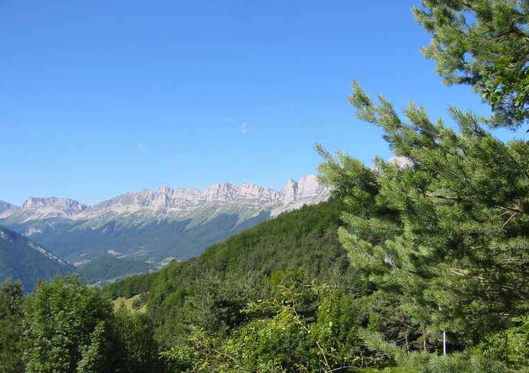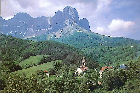 d'orgue, analogue aux "Dolomites"et dominant la vallée verdoyante de St-Andéol. En fond de décor, "le Mont Aiguille" (merveille du Dauphiné) détache ses 2086m et situe l'entrée