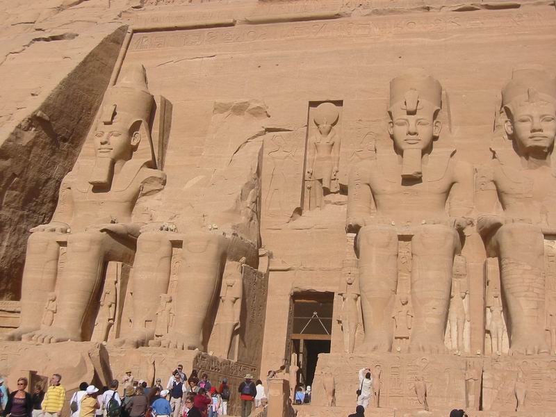 devant l’écluse d’ - Le 4 Avril – nous ne passerons l’écluse qu’à 2H00 du matin, la navigation continue de nuit et nous arrivons à Edfou ver 8H30. Nous sommes pris en charge immédiatement, (au milieu d’une foule de calèches enchevêtrées !) par un conducteur Mustaphah et son cheval « Rambo », dommage que la calèche menace de s’écrouler à chaque tour de roues ! nous finissons par traverser la ville et arriver devant le temple d’Horus, où Ahmed, notre guide, donne toute la mesure de sa culture, et nous inonde de renseignements historiques, tous plus intéressants les uns que les autres ! ce que nous avons retenu ? nous ne vous donnerons pas un cours sur l’Egypte ancienne, d’autres sont plus qualifiés pour le faire ! Cependant Edfou est remarquable par son excellent état de conservation, construit à l’ére des Ptolémée (souverains grecs ayant régné sur l'Egypte), et consacré au dieu Horus, c’est aussi le second temple d’Egypte par la taille, l’entrée est gardée par deus superbes statues du dieu Horus, sous la forme d’un faucon, le mur extérieur est orné de bas reliefs représentant Horus et Hathor (mère d’Horus) à remarquer aussi le grand « couloir des libations » avec ses imposantes colonnes. L’ensemble est de toute beauté, malheureusement le retour est gâché par les exigences du conducteur de la calèche, nous n'avons pas retrouvé Mustaphah, sa calèche ayant rendu l'âme ! . On peut comprendre que le niveau de vie, pousse certains à réclamer force « bakchich », mais trop, c’est trop, c’est un problème que nous avons rencontré souvent, et que devra régler l’Egypte, si elle ne veut pas écoeurer les touristes, source de vie pour le pays ! Nous reprenons la navigation vers Assouan, les bords du Nil sont de plus en plus pittoresques, nous sommes maintenant en Nubie, beaucoup de palmiers a bord du Nil, moins de villages, et le désert tout proche avec ses dunes. Nous débarquons à la nuit, pour visiter le temple de Kom Ombo, absolument superbe, avec ses enormes colonnes, sous les projecteurs, consacré au dieu crocodile, Sobek, dieu de la fertilité et à Haroéris, le dieu solaire guerrier. Nous poursuivons ensuite notre navigation vers Assouan, tout proche, arrivée à 21H00- - Le 5 Avril – réveil à 2H00 ( !!) depart 3 heures en bus et en convoi, avec escorte policière, pour Abou Simbel, 300 kms de route dans le désert, arrivée à 7H00 et visite de ce site impressionnant et prodigieux, quand on pense que ce temple a été entierement démonté et remonté plus haut sur la rive (sous le patronage de l'UNESCO), pour éviter les eaux du barrage d’Assouan. Nous sommes au bord du lac Nasser, retenue de 600kms de long. Le coup d’œil général est extraordinaire, sur les façades de ces deux temples. Statues colossales et à l’intérieur superbes motifs muraux en l’honneur de Ramses II. Le grand temple est dédié aux dieux Amon, Harmakhis, Path et à Ramses II, le petit temple appelé aussi temple d’Hathor est dédié à Nefertari, épouse de Ramses. Visite inoubliable. Retour à Assouan à 12H00 après 300 kms de désert, monotone certes, mais envoutant ! L’après-midi nous visons la ville d’Assouan, magnifiquement située au bord du Nil, dans un cadre de rochers rouges, et de désert de sable très proche. La mosquée avec explications sur les rites musulmans, halte dans un cabaret, pour un spectacle de danses typiques, surtout pratiquées par des hommes, à noter le numéro époustouflant du « derviche tourneur », durant le spectacle, Ahmed en profite pour savourer un narguilé ! (pipe orientale, où la fumée traverse une eau parfumée avant d’arriver dans la bouche). Nous terminons la soirée par un tour dans les souks d’Assouan, particulièrement pittoresques. (Marchandages et palabres sont de rigueur !!).