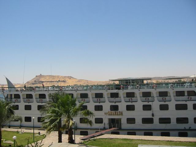 avons effectué, - Le 2 Avril - Partis de l’aéroport de Paris-Charles de Gaulle, le 2 vers 15H00, par la compagnie egyptienne AMC, l’avion un MD83, s’est avéré confortable et l'équipage compétent, après un vol sans problème, nous sommes arrivés en Egypte à Louxor à 20H00 (pas de décalage horaire avec la France), accueillis par les agents de « Capitales Tours », nous avons effectué les formalités de visa et tiré les premières Livres Egyptiennes (un Euro égale 7,50 Livres) au distributeur. Et vers 23H00 nous arrivions au bateau : le « Granada », accueillis par notre guide Ahmed, installation dans une cabine confortable (avec frigo, télé, clim.et une large fenêtre sur le Nil). Ahmed (un garçon très compétent et sympathique) a ensuite tenu une réunion d’information, pour faire le point de la situation, des travaux à l’écluse d’Esna nous obligent à partir à Assouan de suite, nous visiterons Louxor au retour, et le programme sera tenu ! Nous pouvons enfin prendre un repos bien mérité, vers minuit