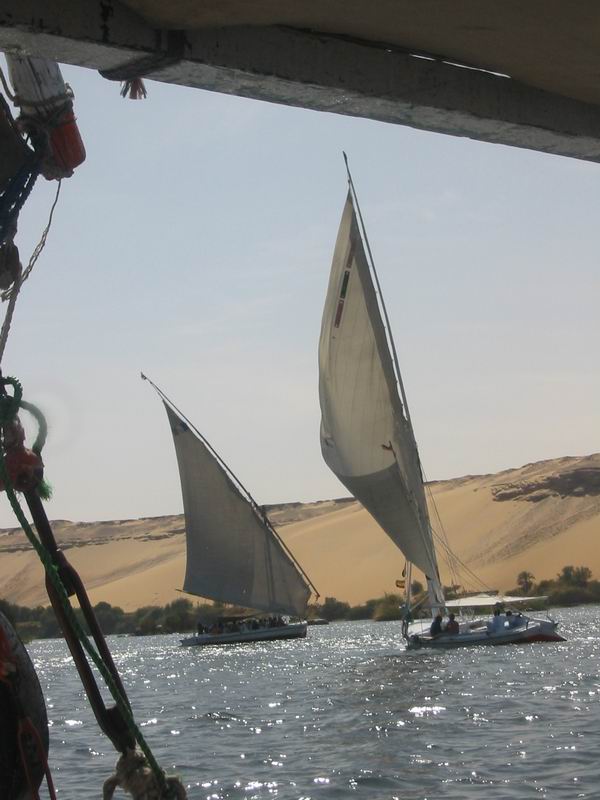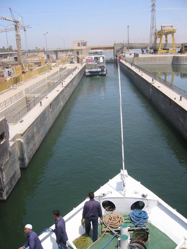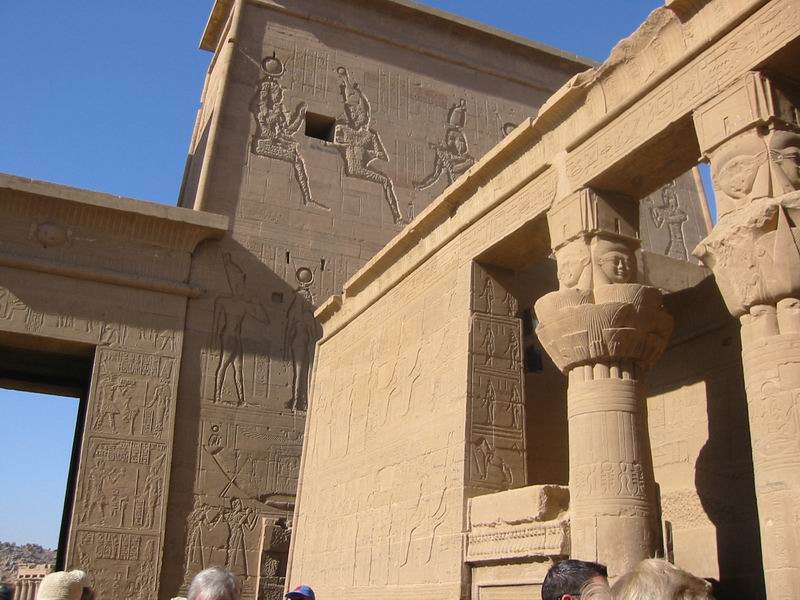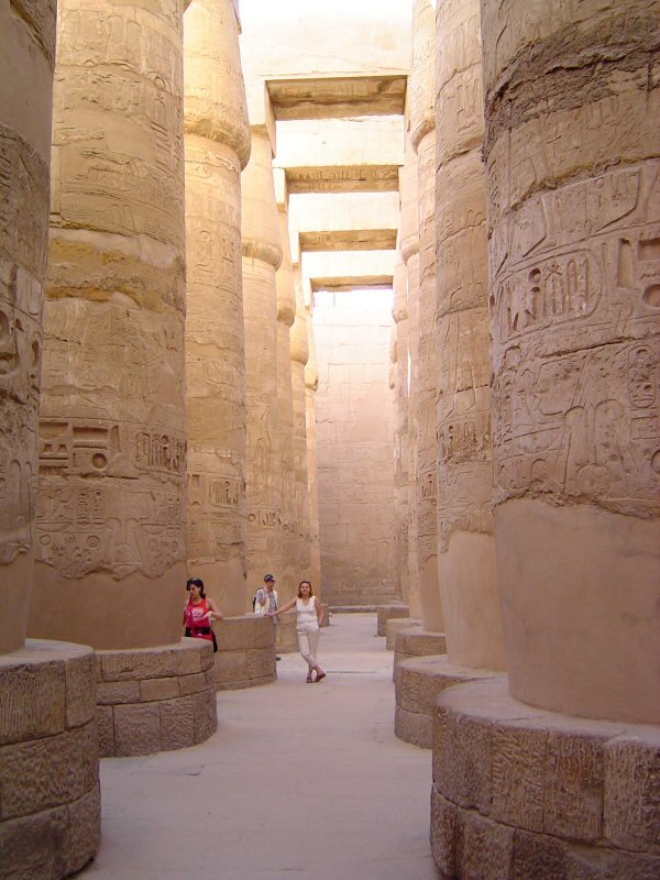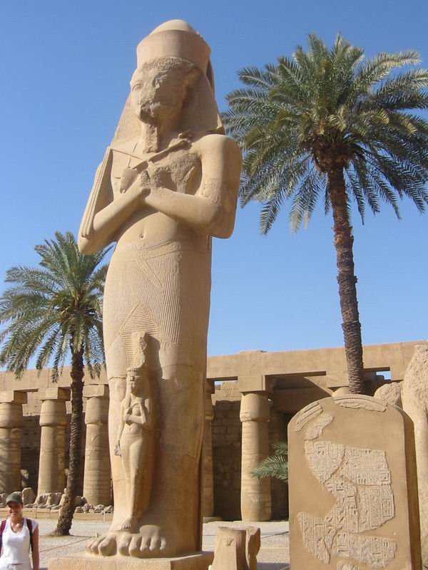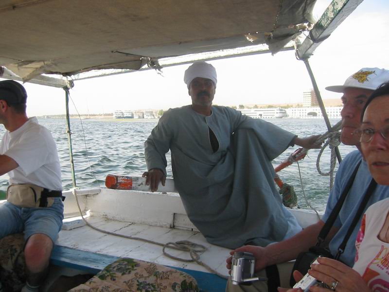 - Le 6 Avril – lever 6H00 et départ pour Philae, ce temple situé sur une île, a été démonté et remonté sur une autre ile, pour éviter la montée des eaux du Nil, après la construction du barrage. Consacré à Isis, en l’honneur du Nil créateur, très bien conservé, on remarque un impressionnant pavillon de Nectanibo soutenu par 14 colonnes, une superbe cour centrale ornée de magnifiques bas-reliefs (hélas certains ont été détériorés par les premiers chrétiens rejetant la religion du passé) et un très beau pavillon de Trojan. Posé sur l’eau, entouré de rochers rouges, c’est vraiment un site extraordinaire, que l’on considère, à juste titre, comme la « perle de l’Egypte » ….Au retour nous visitons une fabrique de papyrus, très intéressant, on nous explique tout le processus de fabrication, depuis la tige de la plante, jusqu’au papier. Magnifiques réalisations des artistes égyptiens et prétexte à l’achat de très beaux souvenirs. Nous enchaînons avec la visite d’une parfumerie, et là aussi démonstration de mélange d’essences et de fabrication des flacons par un verrier. (achats !!) Nous visitons ensuite le grand barrage d’Assouan, il est tellement colossal et intégré à la nature, qu’il est pratiquement invisible et de plus situé dans une zone militaire stratégique…980 M près d'un kilomètre d’épaisseur à la base, 3 kms 800 de longueur, l’ouvrage est stupéfiant, nous pouvons passer sur la crête, où toute photo est interdite…première rencontre un groupe de Japonais, qui photographient tous azimuts ! au grand désespoir de leur guide ! cet ouvrage a entraîné nombre de discussions et de controverses, tout compte fait c’est un bienfait pour l’Egypte qui en tire la plus grand partie de son énergie, et a accru considérablement ses surfaces cultivables et leur irrigation. Au retour visite d’une carrière, avec un obélisque inachevé, resté à l’état d’ébauche, plus de 40 m de long et plus de 1200 tonnes ! Dans l’après midi nous sommes conviés à une sortie en felouque sur le Nil, très agréable expérience, au milieu des dizaines de voiliers, se croisant dans tous les sens, en évitant de justesse, les monstres flottants, que sont les bateaux de croisière. Nous longeons la très belle île Éléphantine, et nous apercevons sur la rive gauche du Nil, le mausolée de l’Aga Khan, construit à la limite du désert.. Le Nil à Assouan est vraiment un spectacle inoubliable ! A la nuit nous retournons à Philae, pour assister au spectacle « son et lumière », magnifique dans ce cadre somptueux, texte un peu lyrique, dit par Suzanne Flon et Jean Topart notamment, jeux de lumières grandioses, une soirée qui restera dans nos souvenirs… retour sur le bateau, pour un dîner égyptien, avec plein de spécialités locales, fort agréables, les participants se sont travestis en égyptiens, et la soirée costumée , avec beaucoup de recherche de la part des voyageurs, fut un franc succès. - Le 7 Avril – Nous reprenons la navigation vers Louxor de nuit, à 6H00 nous arrivons en vue de l’écluse d’Esna, l’attente est moins longue qu’à l’aller et nous pouvons passer vers 11H15 (dénivelé de 3M et deux bateaux par sas). Nous arrivons à Louxor vers 14H00 et repartons aussitôt pour la visite du temple de Karnak, cet énorme temple mérite sa célébrité, superbe, colossal : 156 hectares « Karnak est le plus merveilleux amas de ruines, que l’on puisse voir » disait le célèbre égyptologue Mariette ! Dédié au Dieu Amon le plus grand sanctuaire s’étend sur 30 hectares, le grand temple à colonnes est le plus vaste du monde, il pourrait contenir Notre Dame de Paris toute entière ! la salle hypostyle 102m/53m et ses 134 colonnes (une vraie forêt de colonnes) est prodigieuse, à l’entrée une allée de sphinx a tête de bélier, la grande cour est impressionnante, la plus vaste d’Egypte, on y remarque une gigantesque statue de Pinedjem, l’obélisque de Thoutmosis, le sanctuaire de Montou (dieu de la guerre) , le sanctuaire de Mout (épouse d’Amon) et quantité d’œuvres d’art, que l’on ne peu énumérer, ni expliquer, tellement elles sont nombreuses : il faut venir se rendre compte sur place ! A une époque plus de 80.000 personnes travaillaient pour le temple d’Amon. Plusieurs pharaons ont contribué à son édification : Amenophis III, Ramses 1er, Seti 1er, Ramses II, Thoumosis 1er, sa fille Hatchepsout et Touthmosis III. C’est vraiment une œuvre colossale, qui laisse pantois ! et muets d’admiration !…Retour à 17H00 et visite de la joaillerie, où nous prenons livraison des « cartouches » (emblème égyptien) gravés à notre nom et commandés par Ahmed notre guide.. Ensuite visite d’un magasin de textile et de cotonnades égyptiennes, prétexte à achats et commission à notre guide, mais c’est de bonne guerre ! à la sortie nous nous heurtons à quantité de vendeurs ambulants qui se disputent nos Euros. …affligeant de voir une pauvre vieille se quereller avec des gamins de 5/10 ans, un bout de trottoir et une place au soleil ! Retour sur le bateau soirée orientale avec exhibition de « danse du ventre » (sans commentaires) çà aussi il faut le voir, on ne peut l'expliquer ! Hélas, pas de photos possible...