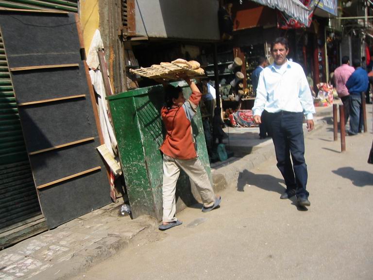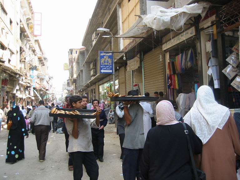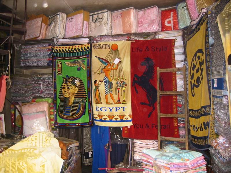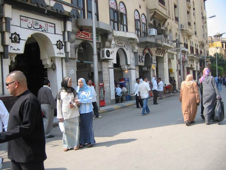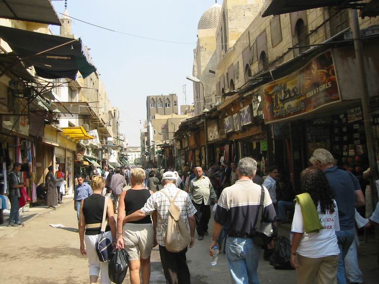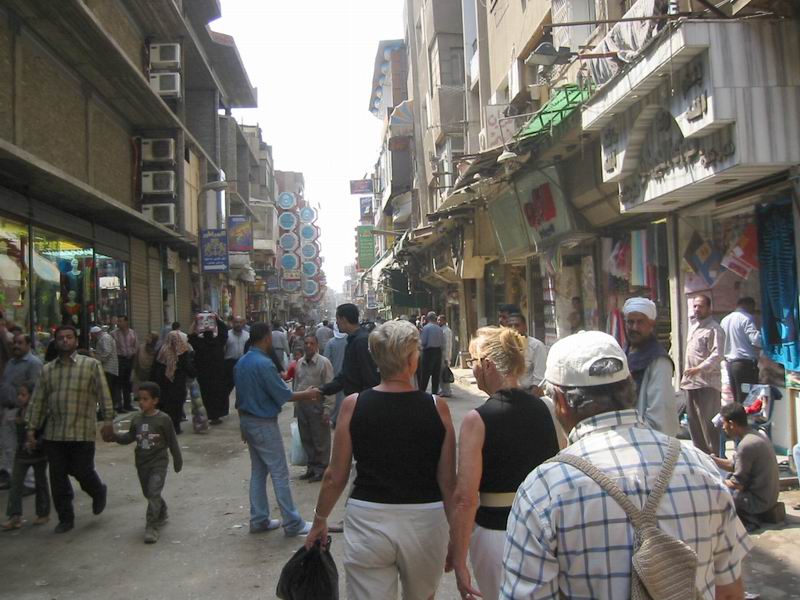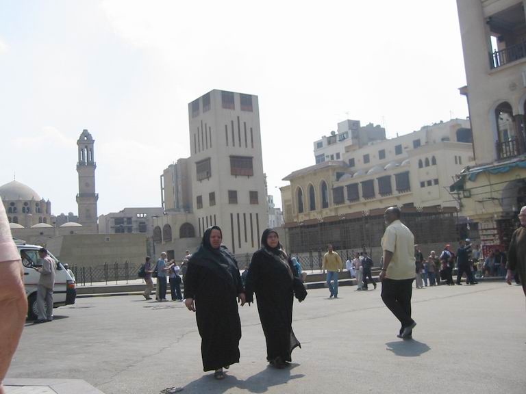 - Le 15 Avril - matinée libre, pour aller déjeuner en bus, nous traversons les beaux quartiers du Caire, sur les rives du Nil, belles avenues, grands immeubles cossus et commerces de luxe. Nous déjeunons au bord du Nil, le cadre est superbe, mais le repas est encore plus médiocre que d'habitude ! nous en faisons part à notre guide, au cours de l’enquête de satisfaction que nous devons remplir…Nous continuons par une visite du " souk", les abords sont étroitement surveillés, les sacs des égyptiens sont contrôlés, pas les nôtres ! (Personne ne semble y trouver à redire !). Nous pouvons déambuler dans ce quartier typique, sans être trop importunés par les vendeurs, les échanges sont « bon enfant » et souvent on s’excuse de nous solliciter ! Évidemment quelques achats s’imposent, car nous partons demain. Enfin si l’on peut dire, car nos bagages doivent être devant la porte de la chambre à 23H30.
