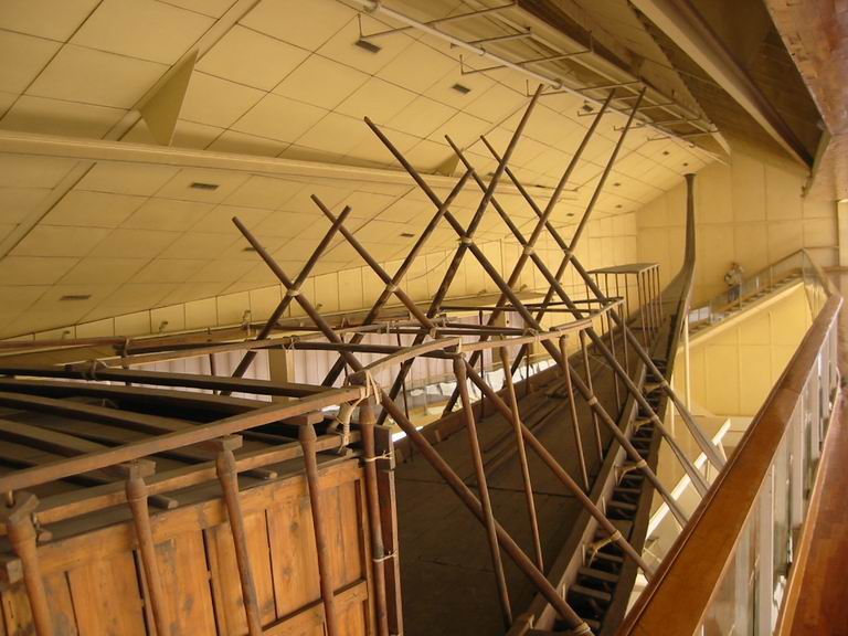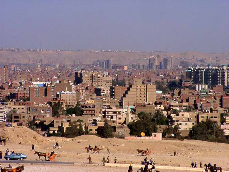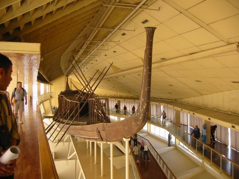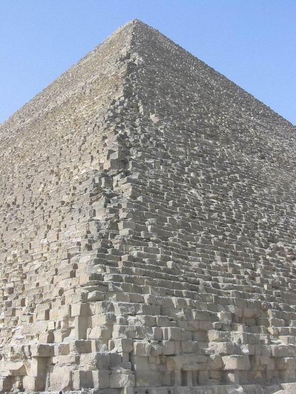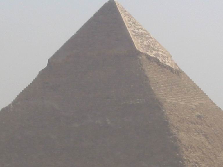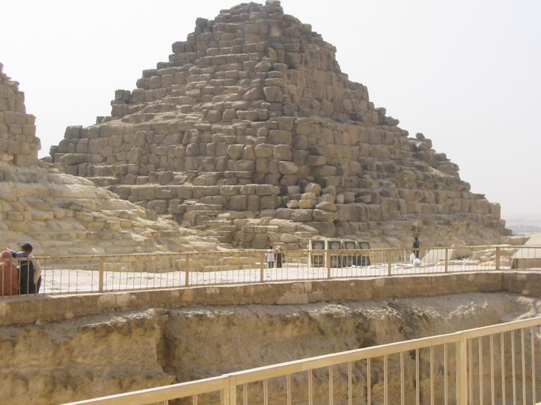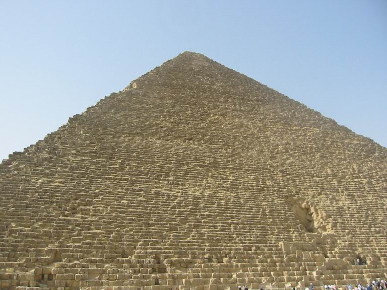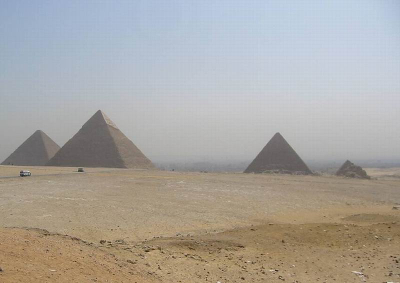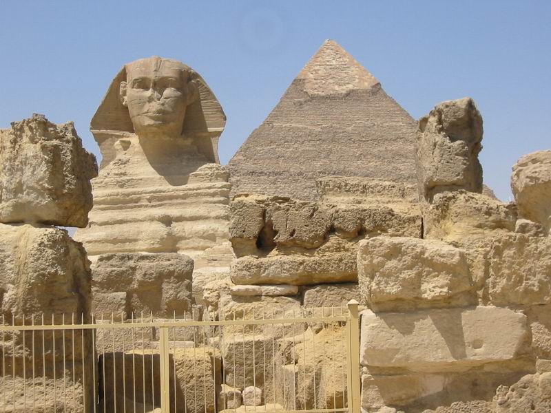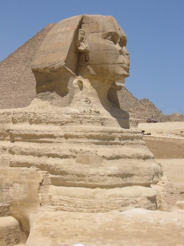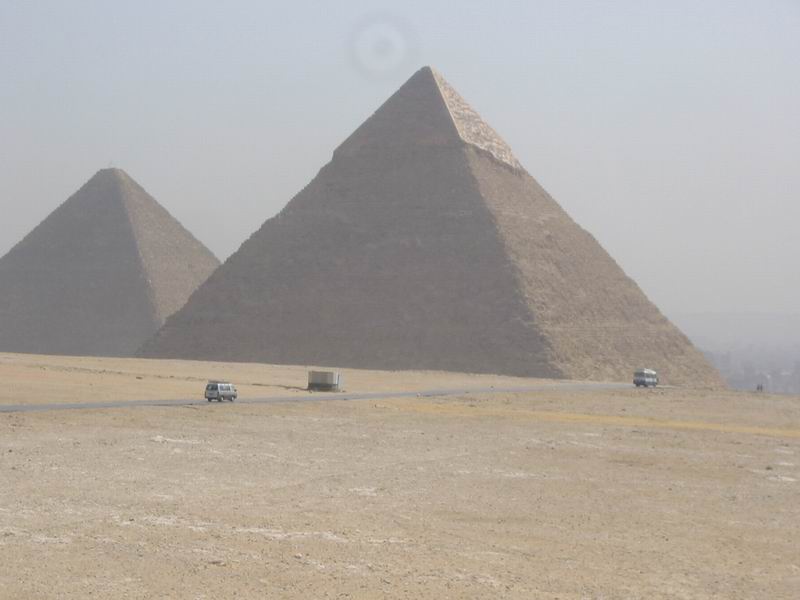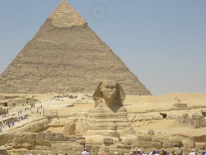Egypte suite Le 14 Avril – ce matin, direction les Pyramides de Guizéh (GIZA), ce site fait rêver nombre de gens dans le monde, et on peut les comprendre, c’est tout simplement extraordinaire, magnifique, grandiose, les superlatifs nous manquent ! Surprise, car c’est en débouchant derrière les immeubles du Caire, que l’on aperçoit les Pyramides. En bordure de ville, ce site est pourtant bien mis en valeur…car en se mettant le dos au Caire, on voit ces constructions fabuleuses, sans qu’aucun édifice ne vienne gêner le point de vue. (Cela mérite largement le voyage). C’est tout d’abord un ensemble de monuments de forme parfaite et de dimensions gigantesques. Les trois grandes Pyramides de Khéops (la plus grande), Khéphren (qui a gardé une partie de son revêtement calcaire) et Mykérinos (la plus petite) sont accompagnées d’un ensemble de petites pyramides satellites (dites Pyramides des Reines) et de centaines de « mastabas » (tombes creusées dans le sol et recouvertes d’un monticule).. On peut les toucher, mais interdiction de les escalader. On trouve également devant Khéphren, le célèbre Sphinx et la « barque solaire » abritée dans un bâtiment disgracieux aux pieds de Khéops. A quoi servaient les Pyramides : à abriter les tombes des Pharaons, mais pourquoi cette forme ? comment les a-t-on construites ? on ne sait pas trop ? (en tout cas quelle prouesse technique !). Khéops largeur 233m, hauteur 146m, 5 hectares et 2.600.000 m3de pierres. Khéphren parait aussi haute que Khéops, mais ne mesure que 136m , large de 210m, et 1.600.000 m3 de pierres, elle a gardé au sommet un peu de son revêtement calcaire. La plus petite Mykerinos ne fait que 66m de haut et 108 m de large. N’oublions pas le Sphinx, énorme statue en forme de lion et à tête d’homme (effigie du roi Khéphren) 73m de long et haute de 20m, le visage faisant 5m, il est dommage que des soldats (Mamelouks turcs) se soient entraînés à tirer sur son nez qui est brisé ! La construction de ce site a eu lieu, il y a plus de 4500 ans. Et ce qu’on imagine mal, c’est la superficie, et la distance entre les monuments qui nécessite l’usage de bus.