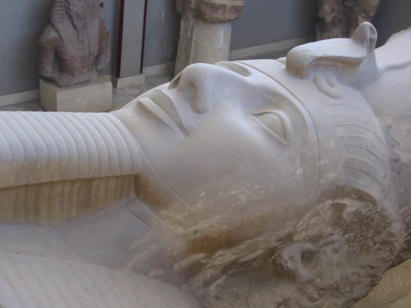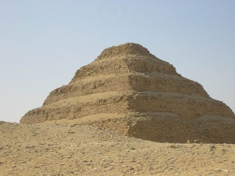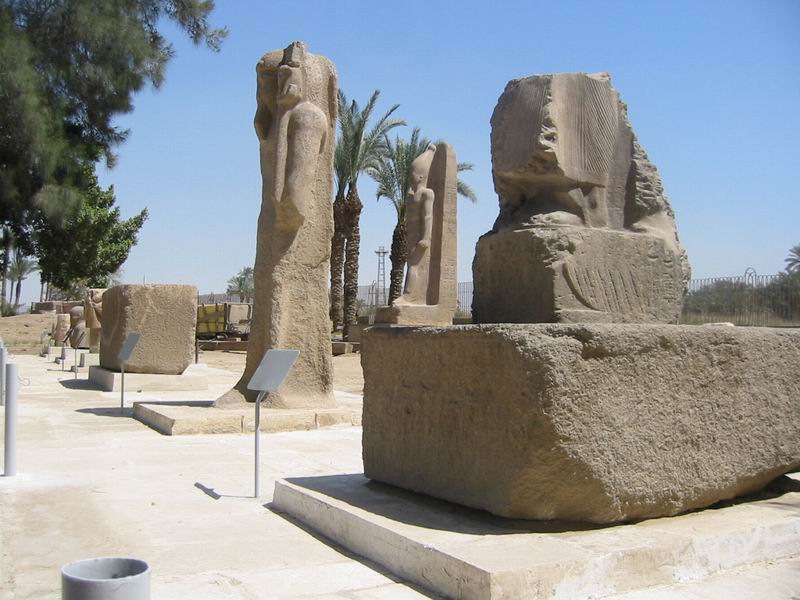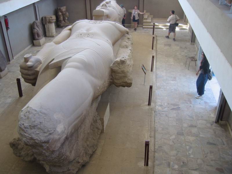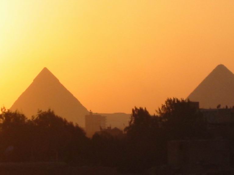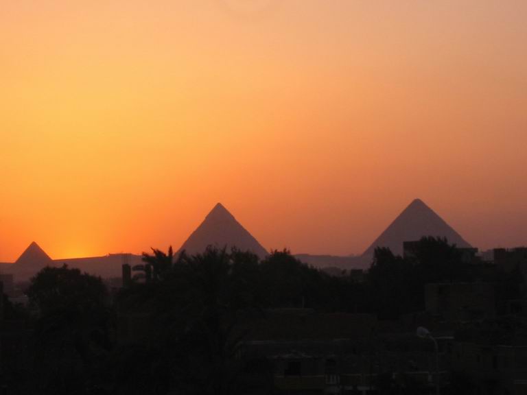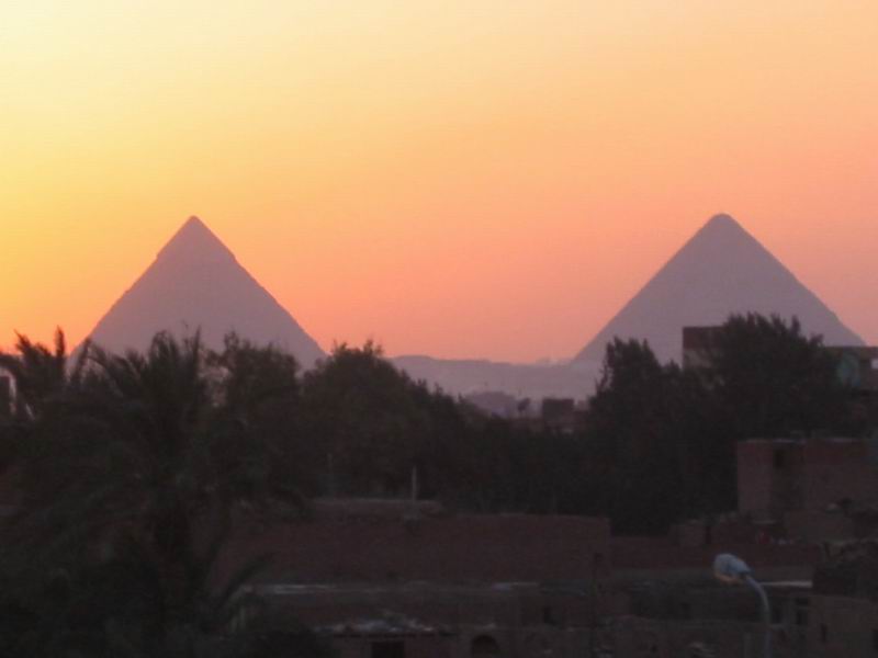 déplacent à dos de chameau ! Il ne faut pas être claustrophobes pour pénétrer dans les couloirs des Pyramides, ni avoir peur de ramper dans la poussière, finalement nous avons renoncé ! Après un nouveau repas médiocre, nous nous dirigeons vers Memphis ( ancienne capitale de l’Egypte) hélas, il reste bien peu de choses, quelques blocs disséminés sous les palmiers. Il reste cependant une très grande statue de Ramses II (13 m) et un très beau sphinx en albatre. Nous poursuivons la visite, en nous rendant à Saqqarah, où la célèbre Pyramide de Djoser (haute de 60m) , en escaliers, fut construite par le grand architecte (prêtre et médecin) Imhotep. Celui-ci fut divinisé par les Grecs sou le nom d’Asclepios (Esculape Dieu de la Médecine). Imhotep construisit cet édifice 2800 ans avant JC et il eu sans doute, le premier l’idée de cette forme de construction. Saqqarah est la plus vaste nécropole d’Egypte, abritant de nombreuses tombes de divers dignitaires . Ces « Mastabas » dont les salles souterraines sont recouvertes de magnifiques fresques, ne peuvent pas toutes se visiter. Notre journée fut bien remplie, et pour terminer en beauté, nous sommes allés voir sur le toit de l’hôtel, (photos bien sur) le coucher de soleil sur …les Pyramides ! |