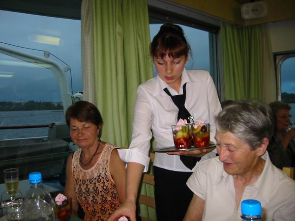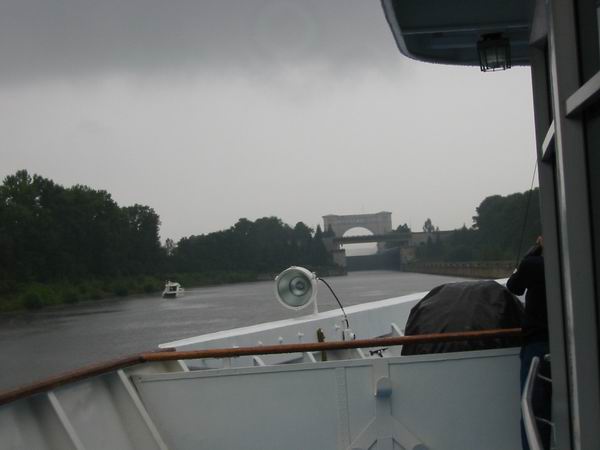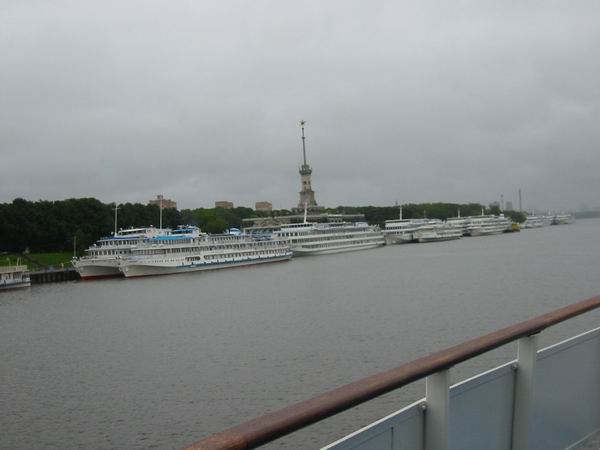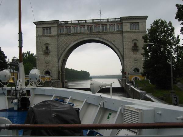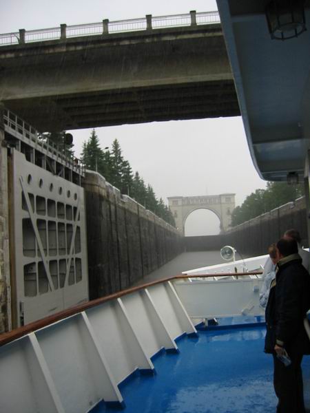 pluie…de vieilles dames "babouchkas" vendent des fleurs de leur jardin sur l'embarcadère, émouvant ! à 9heures le navire appareille pour Moscou ! passage de la superbe écluse d’Ouglitch, batie en forme de porte surmontée d’un arc ! ces écluses sont absolument remarquables, 300m de long, 14m de dénivelé, on passe généralement à deux bateaux en quelques minutes…Nous quittons la Volga et naviguons maintenant dans le canal Volga/Moskova…Durant la journée diverses activités nous sont proposées. Concert d’accordéon et balalaika, Film retraçant le premiers jours de la croisière…et pour terminer : le bouquet, le repas du Commandant, tenue correcte…repas plus que correct, allocutions du Commandant et du Directeur de croisière Serguei, qui nous régale une fois de plus, avec son français sans accent, d’une bonne petite histoire « croustillante »…la soirée se termine par le gala des « talents du bord », présenté par les passagers ! de très bonnes et sympathiques prestations …sketchs, chansons, danses etc...