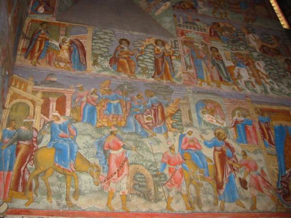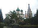 voutes, entiérement décoré de fresques relatant l’Evangile, le tout est surmonté d’un très beau clocher doré de 37m de haut… au