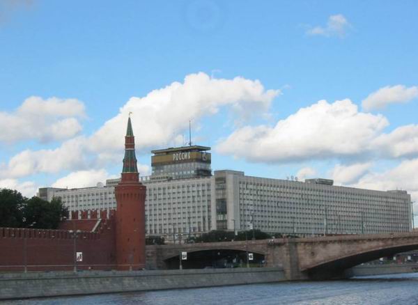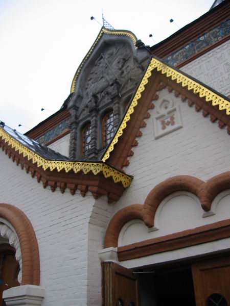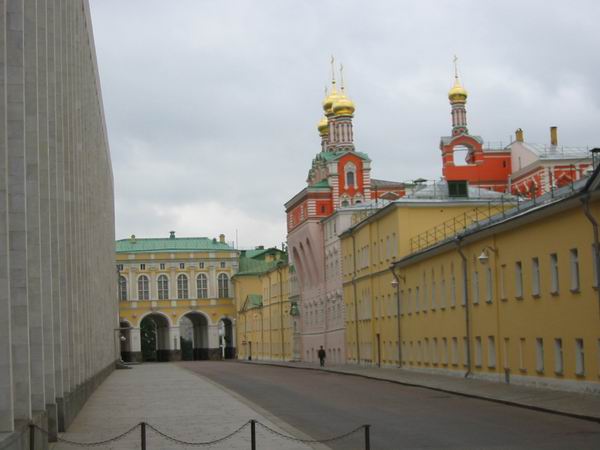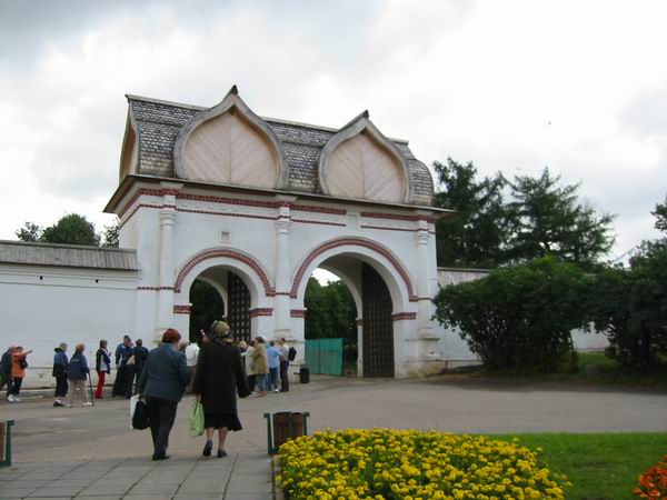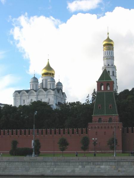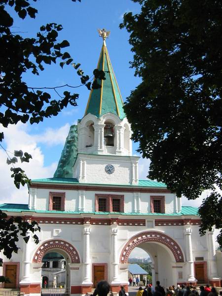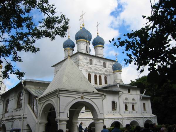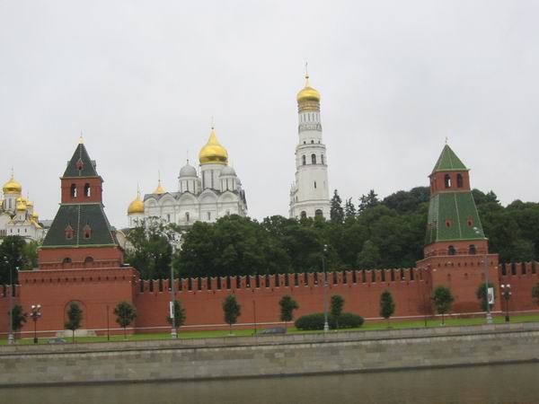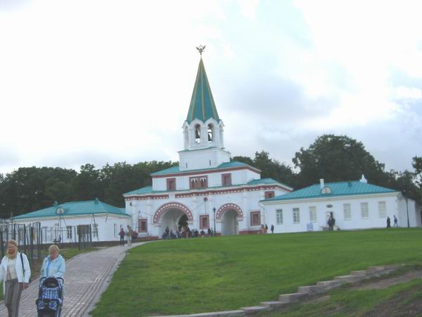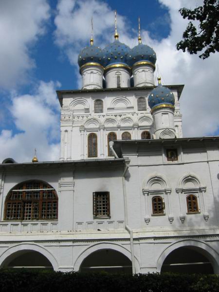 L'Après-midi, beau temps, nous allons rendre visite au domaine de Kolomenskoie, une des résidence préférées des Tsars, musée d’architecture en plein air, l’ancien Palais en bois n’existe plus, grand parc avec Eglise de l’Ascension, Notre dame de Kazan (et ses coupoles bleues, étoilées d’or), un musée et l’Isba de Pierre le Grand, très typique en rondins de bois ! Nous revenons au bateau en longeant la Moskova et en admirant au passage les differents quartiers de la ville, le Kremlin omniprésent, le théatre du Bolchoï, la nouvelle place du Manège (et son centre commercial souterrain sur quatre niveaux) beaucoup de constructions en cours, et d'immeubles en rénovation, On a meme reconstruit des églises disparues comme la « Cathédrale de la Vierge de Kazan » près de la Place Rouge , ou construit des nouvelles comme la "Cathédrale du Christ-Sauveur" qui remplace, la célèbre piscine en plein air du Moscou des années « Kroutchev ». On remarque de nombreux édifices de type stalinien, à l’architecture contreversée, mais qui plait de nouveau, on en a repris la construction !!