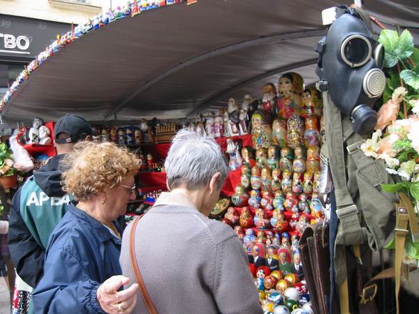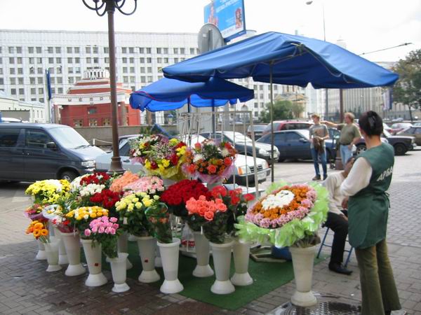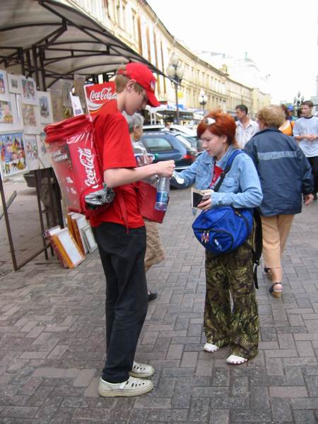 la rue Arbat, (le cœur de Moscou), rue piétonne, grosse affluence, nombreuses boutiques, échopes de souvenirs, cafés, restaurants (dont le fameux Macdonald), peintres en plein air, marchands ambulants, notamment un curieux vendeur de coca, qui porte une glacière
