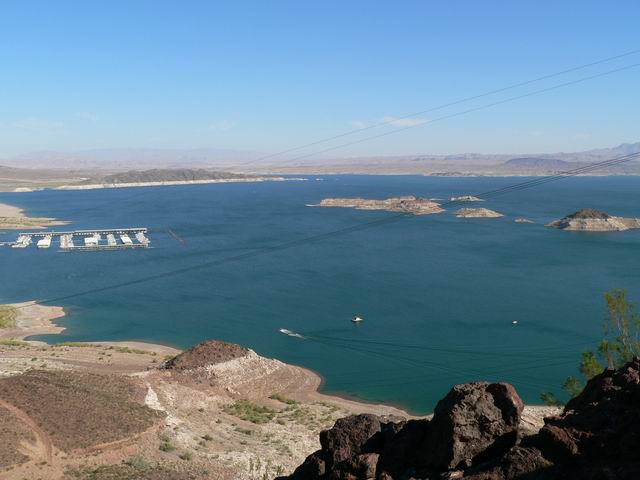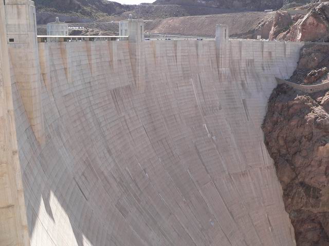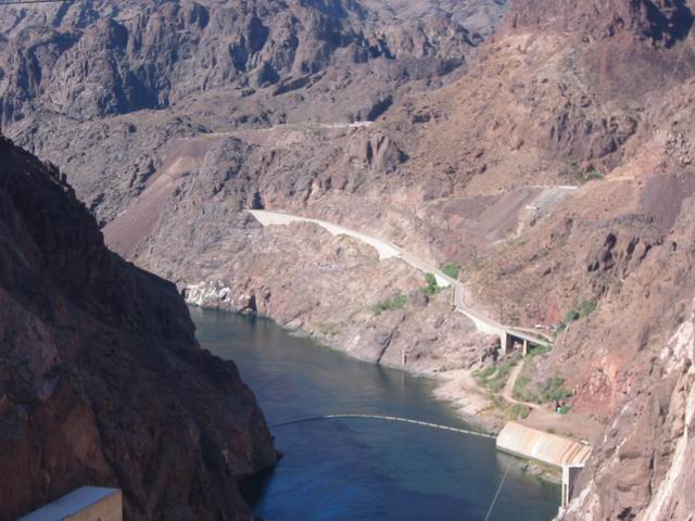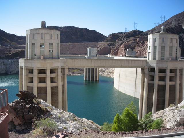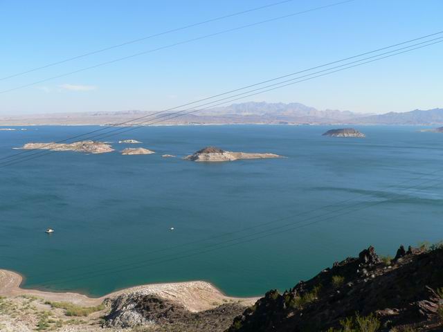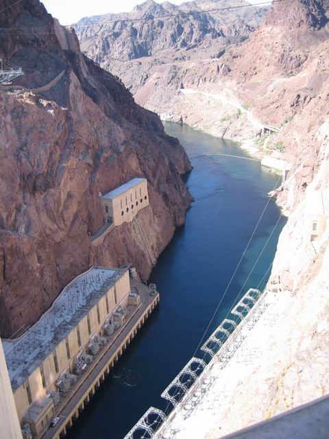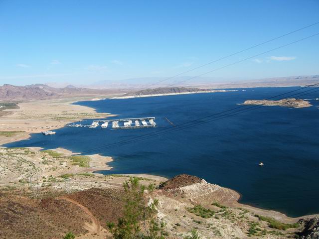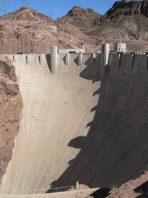 Jeudi 17 Aoùt : nous partons tôt car la journée sera bien remplie ! avant d'arriver à Los Angeles ...le Lake Mead nous attend, tout proche ! superbe bassin de 106kms de long! les eaux d'un très beau bleu azur, font un magnifique contraste avec les couleurs ocres des montagnes environnantes... ce lac est formé par la retenue du Colorado derrière le barrage "HOOVER DAM" au niveau du "Black Canyon", l'accès à cet ouvrage est particulièrement spectaculaire, route en lacets, gorge profonde, (actuellement un viaduc est en construction pour passer d'Utah en Arizona, sans emprunter la route sur le barrage) tout est parfaitement organisé, parkings, visitor center, visites guidées, y compris dans l'usine hydroélectrique. Nous préférons flâner aux abords et sur l'ouvrage en prenant des photos ! Cet endroit mériterait une journée à lui seul ! Vous trouverez dans ce lien, des renseignements techniques sur cette gigantesque réalisation...