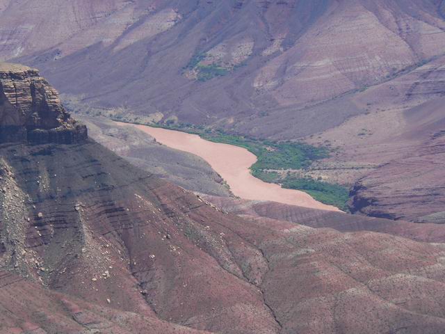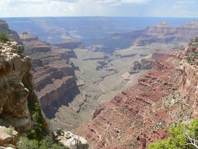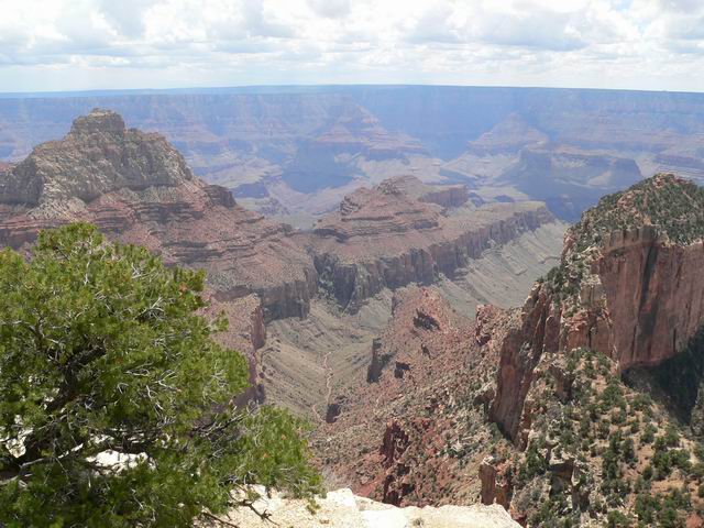 Mercredi 16 Aoùt : Nous avons bien l'intention de profiter jusqu'au bout de ce séjour à North Rim, nous disposons de la matinée, pas suffisant pour faire le sentier qui descend au Colorado, car il faut plus d'une journée, et 22 kms pour rejoindre le fleuve, qui coule 1800 mètres plus bas, et remonter ensuite. Il faut trois jours et 34kms pour rejoindre la rive Sud... Tout est colossal, nous nous contenterons des points de vues ! Après un solide breakfast pris au Lodge nous quittons nos sympathiques maisonnettes pour rejoindre le superbe panorama d'Angel Point, que nous n'avons pu explorer à notre gré hier, suite à l'orage. Il ne faut pas craindre les distances, 60kms aller et retour pour ce point de vue, qui s'avère "royal", effectivement c'est le nom donné à la pointe la plus avancée, "Cap Royal" , les mots nous manquent pour qualifier les splendeurs que nous découvrons, le gouffre de 1800m, et le Colorado qui ressemble à un filet d'eau, au loin la rive sud dans le flou ( South Rim ), partout des falaises à dominante ocre et rouge, très peu de végétation, et encore nous sommes sur la rive nord, la plus boisée, la rive sud vue de loin est absolument lunaire !!