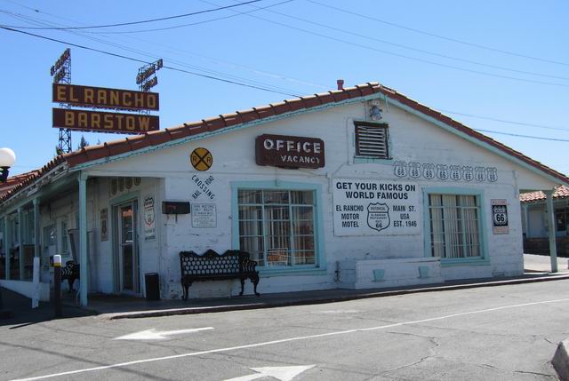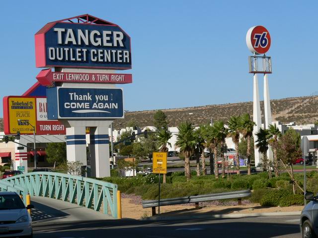 Il fait déjà très chaud, 37°, nous reprenons notre route, en contournant Las Vegas, par le Sud, nous pouvons jeter un dernier regard sur les hôtels prestigieux qui se profilent à l'horizon ! Nous nous dirigeons vers Los Angeles, par l'autoroute 15S, qui traverse le désert de Mojave, nature particulièrement dénudée et sauvage, cependant des casinos fleurissent çà et là, au niveau de la frontière Utah/Californie, dans ce désert. Nous atteignons Barstow à l'heure du déjeuner, et là par hasard nous découvrons la "route 66" qui passait effectivement à Barstow, cette route mythique, abandonnée depuis les années 80, a été morcelée, débaptisée et transformée en autoroute en de nombreux endroits des USA, elle va de Chicago à Los Angeles, nous avons pu la croiser ici, où de nombreux souvenirs subsistent, motels de l'époque, panneaux, et même un musée... c'est assez émouvant de retrouver ces traces d'un passé pourtant assez proche, mais presque effacé... Mais, le temps presse ! on nous a recommandé de ne pas manquer d'aller faire des emplettes dans de super "magasins d'usine", les "Outlets", situés à Barstow, la recherche fut longue et difficile, et les explications des gens du cru, nous renvoyant dans tous les azimuts, ne nous ont guère facilité la tâche... nous pensions abandonner pour finalement trouver les Outlets aux bords de la route 15S en repartant !! imaginez d'immenses entrepôts, où toutes les grandes marques de vêtements, de chaussures, d'articles de sports, de voyage etc etc.. sont représentées ! il faut prendre la voiture pour aller d'un entrepôt à l'autre !! les prix, attrayants certes, compte tenu de la dévaluation du dollar par rapport à l'Euro, mais pas révolutionnaires ! Les dames et les enfants de notre groupe, furent pris d'une frénésie pratiquement "incontrôlable", tout acheter, impossible !! enfin tout voir, tout comparer !! nous avons passé là, plusieurs heures, de loin les plus fatigantes de notre voyage, mais nous avons eu l'impression de faire de bonnes affaires ! et nous sommes repartis en fin de soirée vers Los Angeles, très en retard sur notre horaire, mais qu'importe, il faut se faire plaisir quelquefois !! un conseil toutefois, aux éventuels acheteurs, bien vérifier l'article, des imperfections peuvent exister !