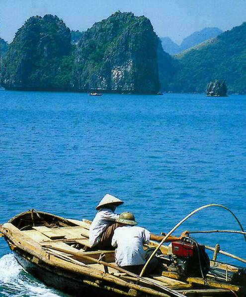 sampans à moteur, (les voiles typiques ont pratiquement disparu de la baie d'Halong), des moteurs
