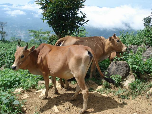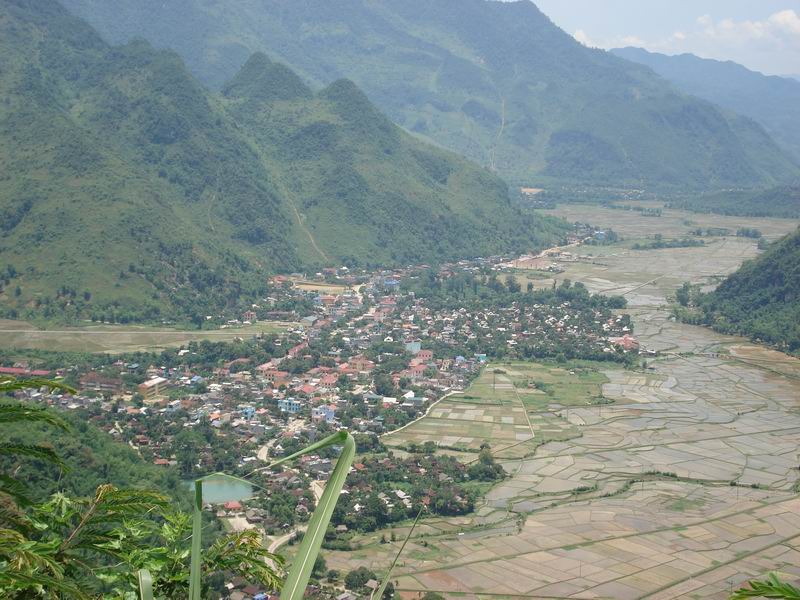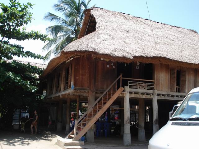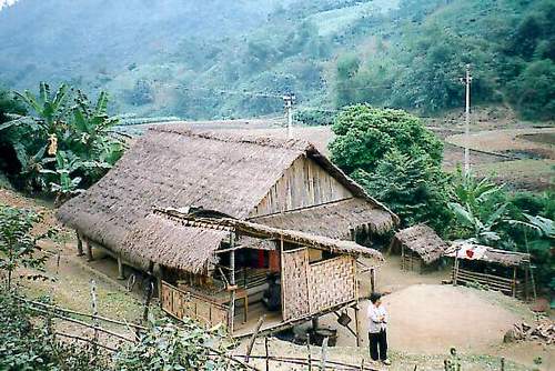 10 - Hoa Binh est la capitale du pays Muong, ville de mixité ethnique, également habitée par des "Thais", cette ville fut évacuée par les Français, après une longue bataille, elle se trouve sur la route de Dien Bien Phu (autre site de bataille! bien connu). Nous commençons la visite par une excursion en territoire "Muong", aux habitations caractéristiques, la culture du riz, se pratique encore sur "brulis" et la chasse est une des activités de ce peuple. Nous visitons une de ces habitations, bien reçus par nos hôtes, et nous apprécions la rusticité du lieu. Cependant, une petite incursion du progrès, des fils électiques arrivent à la paillotte, et une télévision trône dans la pièce principale... Les Muongs vivent encore sous le régime matriarcal et